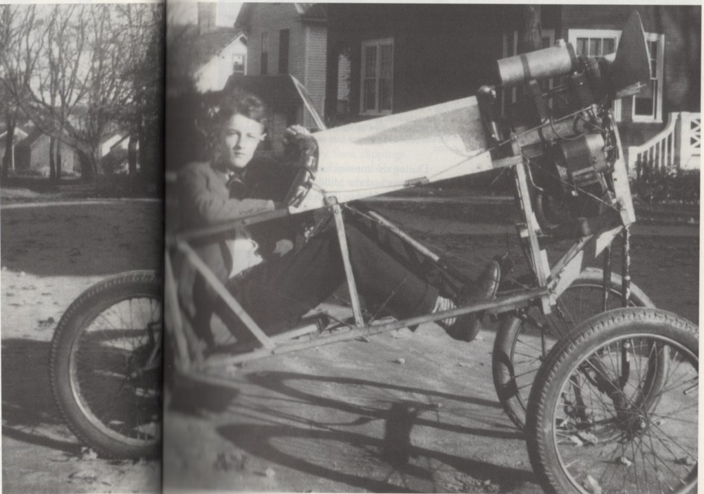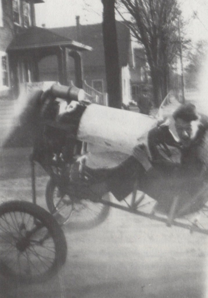 But, as described in Equations of Motion, the Aero-Triple-Cycle No. 1 “was an air-propelled hybrid. It was steered by a pair of front wheels, braked by a single wheel at the rear, and had a light, airplane-like structure. This 1928 machine served as my transition between ground and air vehicles.”
