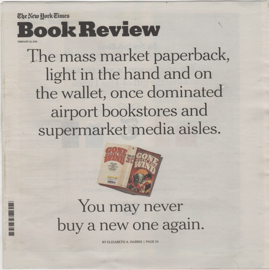 These personal comments are preface to Elizabeth A. Harris’s “So Long to Cheap Books You Could Fit in Your Pocket,” The New York Times, February 6, 2026 (reappearing in The New York Times Book Review, February 22, 2026).