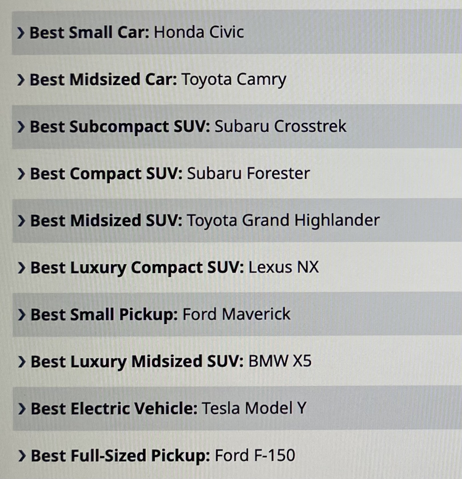 Consumer Reports’ Top Ten. Automotive News’ Molly Boigon observes, “Nine of the 10 top picks have hybrid options. The remaining vehicle is fully battery-electric. For five of them, Consumer Reports either recommends a vehicle that is sold only as a hybrid or gives the nod to a hybrid variant instead of a model’s gasoline version.”