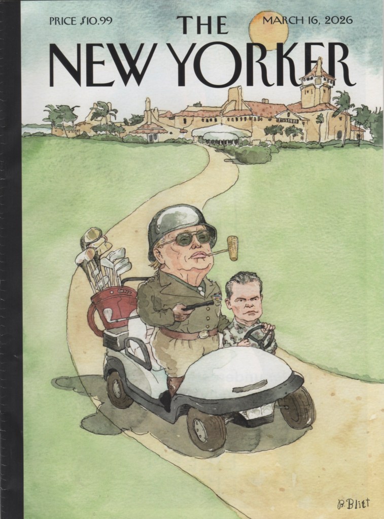 This recent Blitt is spot-on. There’s a short-fingered vulgarian portraying a military hero (despite bone spurs, perhaps mistakenly remembered on his heels, not his head). The driver, understandably smaller-statured and carefully quaffed, is shown with both hands on the wheel, not texting away exact attack times, SignalGate fashion.