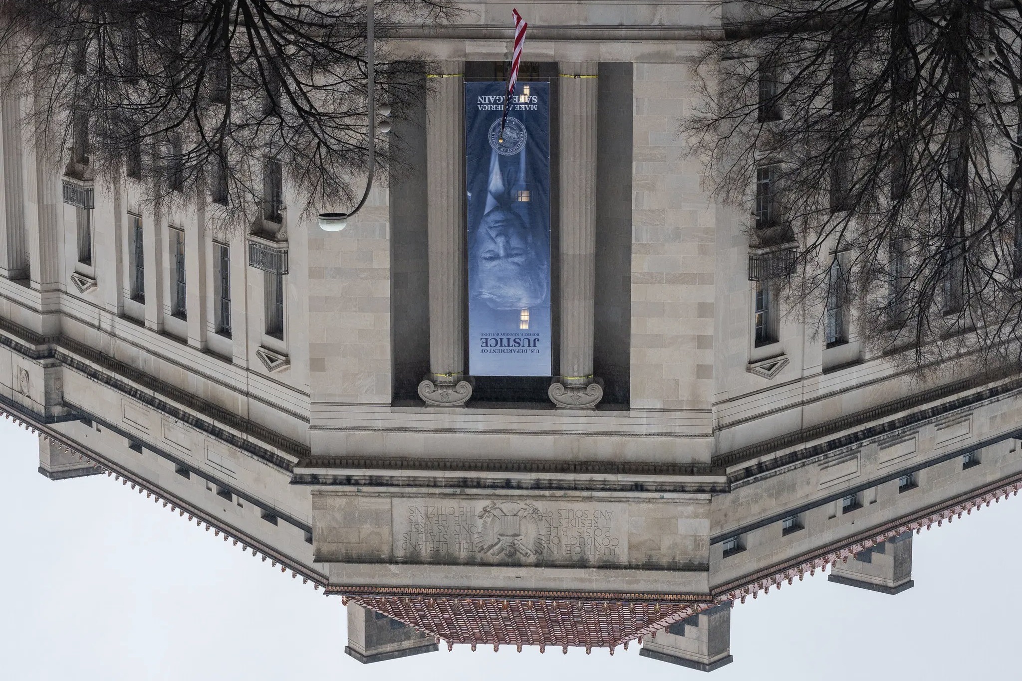 Ashley Ahn observes in “New Trump Banner Hung on Justice Department Headquarters,” The New York Times, February 19, 2026: “Large banners of President Trump now hang from multiple federal buildings in Washington, including the nation’s top law enforcement branch, in a bold statement of power and influence over the government…. The signage is a strikingly prominent indication of how Mr. Trump has eroded the separation that has long existed between the Justice Department and the White House to protect the department from political influence.”