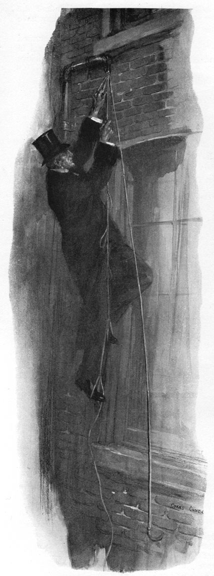 Raffles and his rope ladder. Illustration by Cyrus Cuneo (1905) from Wikipedia.