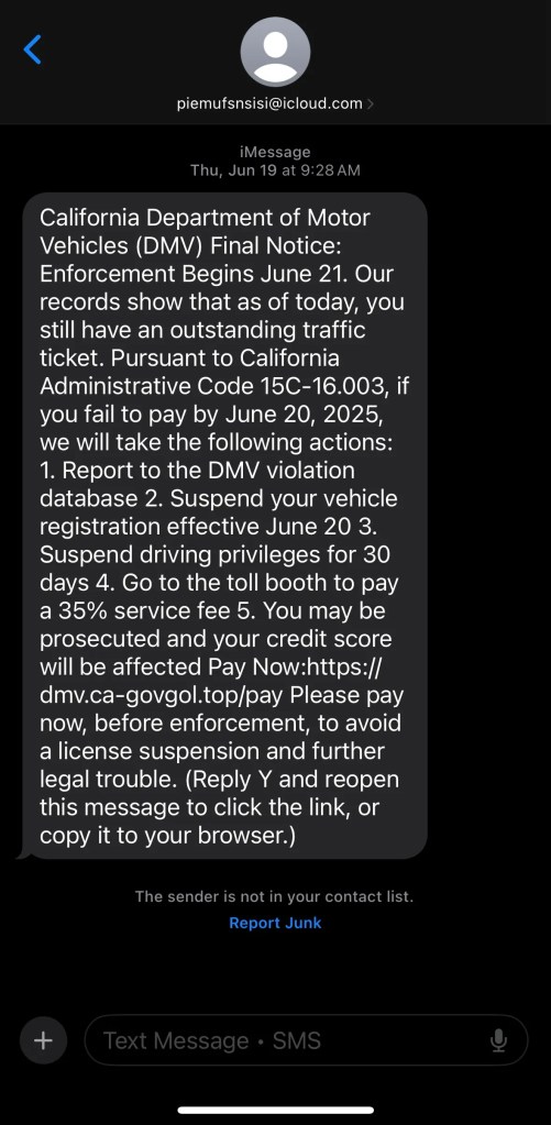 In assessing messages, I’m especially suspicious of when the URL mismatches the alleged messenger. For example, here a warning from “the DMV” threatens about a phony traffic ticket—yet has an obscure url piemufsnsis@icloud.com.