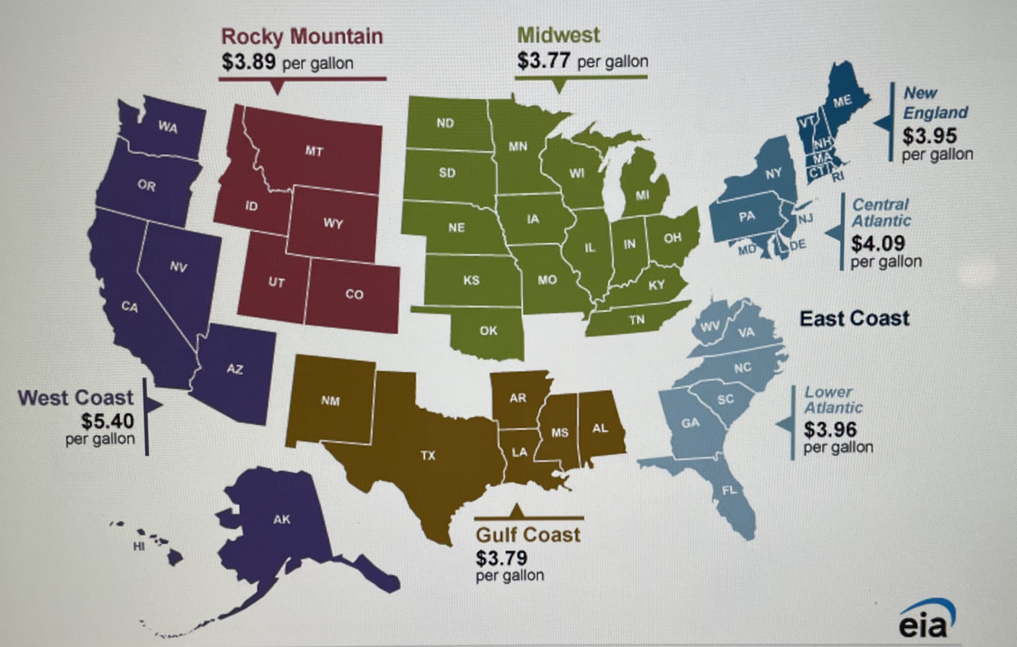 Boigon continues “Refineries service parts of the U.S. via pipeline, which is the cheapest, fastest and cleanest method of transporting gasoline. For example, New York gets a lot of its gas via pipeline, [Stanford University’s] Sonin said. There are no major pipelines bringing gasoline into California.”